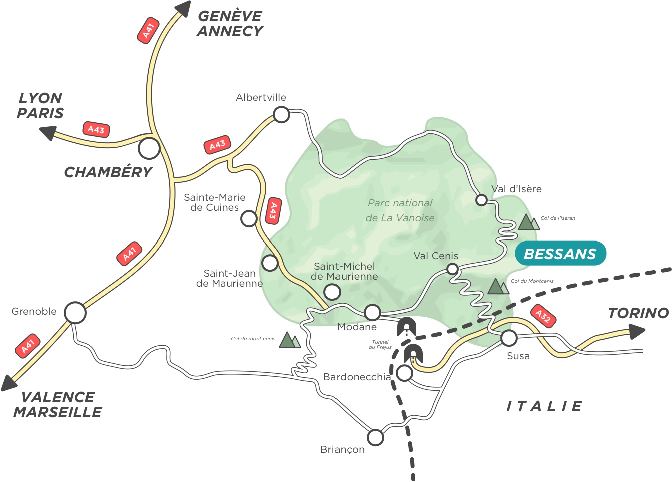 • De Lyon direction Chambéry-Turin par la RN6 ou l'autoroute A43 jusqu'à Modane (Le Freney)